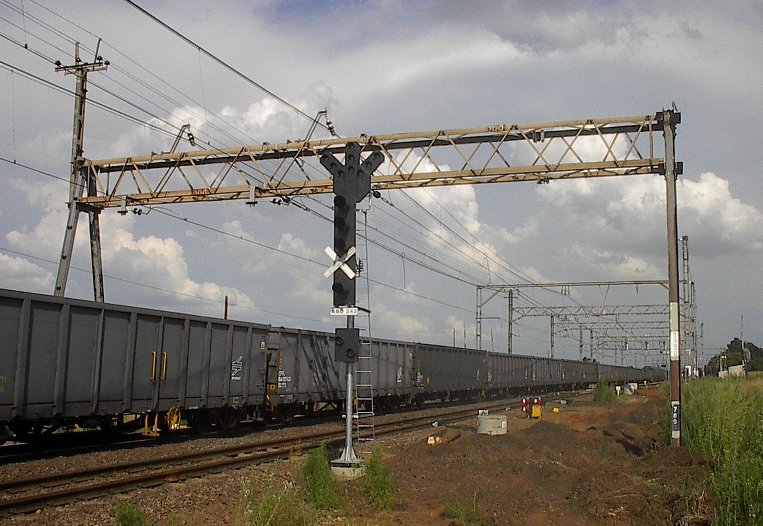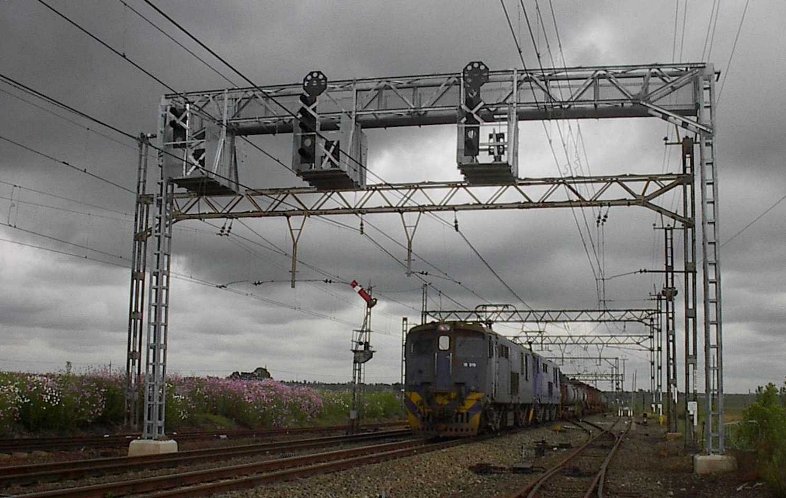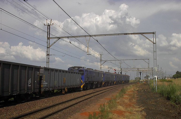 Four class 10E's head up an eastbound block of 80 x type CFR wagons. The down home signal is visible above the second loco, new CTC colour lights installed but not operational.