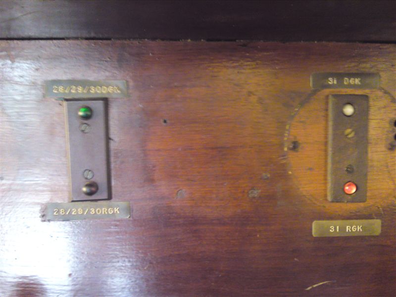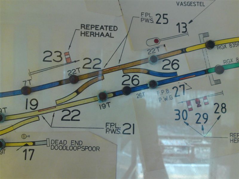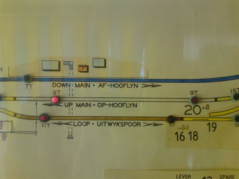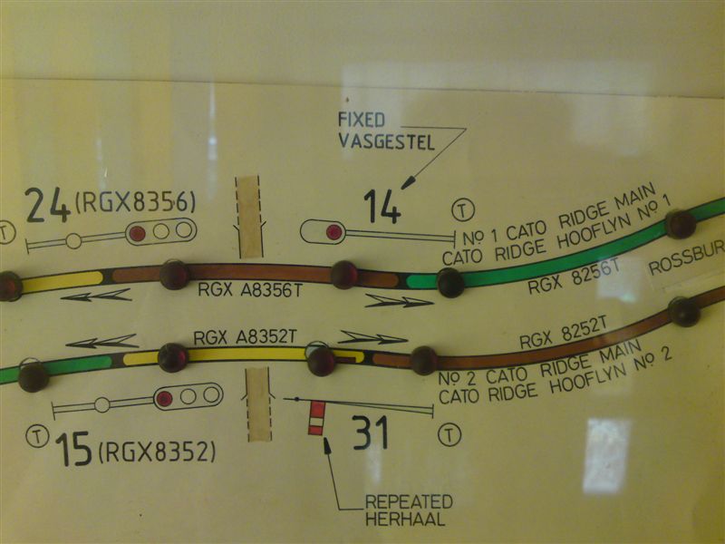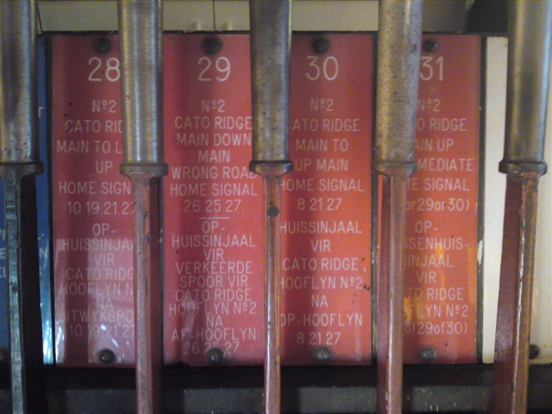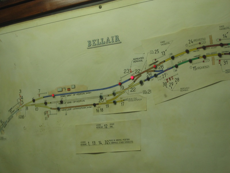 Pictures of the lever frame at Bellair, taken by Greg Hart. Bellair used to be equipped with lock �n block to Rossburgh until CTC Durban took over in-between 1984 & 1987. Before then, the station was manned 24 hours a day then because of coal trains running to the Umgeni power station in New Germany, a branch/siding off of Sarnia. The up outerhome and distant signal were then replaced on the Rossburgh side with a single intermediate home signal. Bellair now has its own panel to give up & down routes to CTC, and this can be seen in these views of the frame. Both the advance starting signals are colour lights which are operated by the frame. The Van Schoor single line system is still in operation to Malvern.