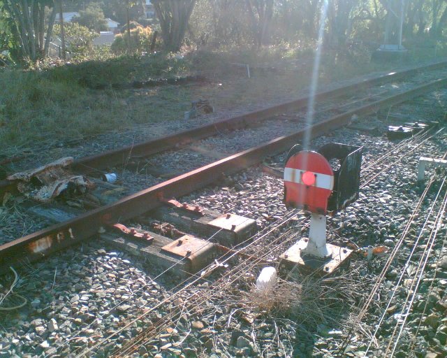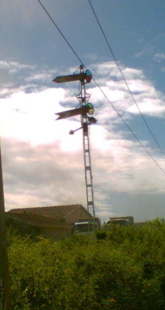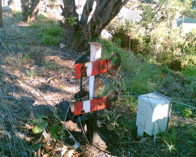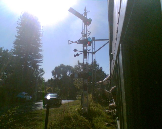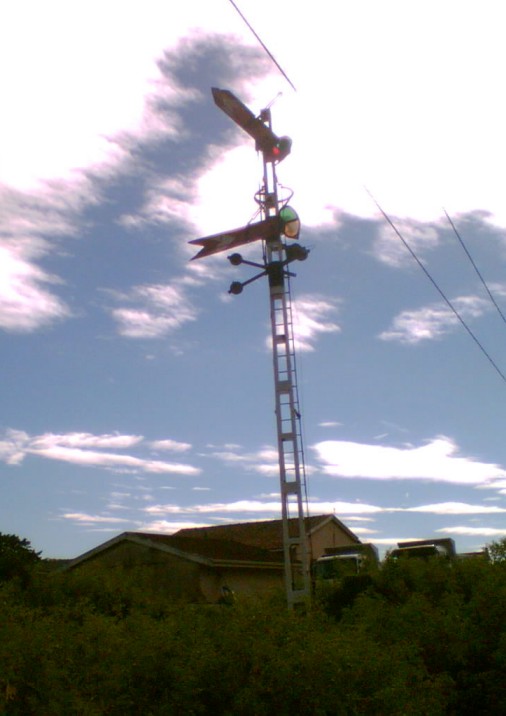 The Home Signal post on the Malvern side recently got blown down by the wind (early 2005) but has been replaced in this picture by Greg Hart, although the arm for entrance into the loop line seems to be gone. This post also features a "wrong road" signal although it would be cleared much less often.