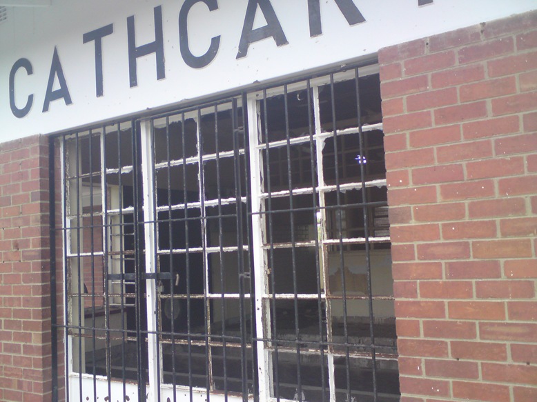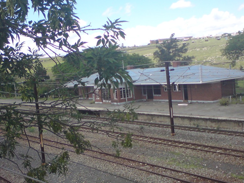 Cathcart is a small town on the main line from East London up to the Highveld, situated 149 kms from East London near the scenic Amatola mountains. It had a 24 lever frame up until the turn of the century, when the line was converted to radio operation and all semaphore signalling removed. The station building and signalling area can be seen in this picture, and look reasonably intact from a distance.