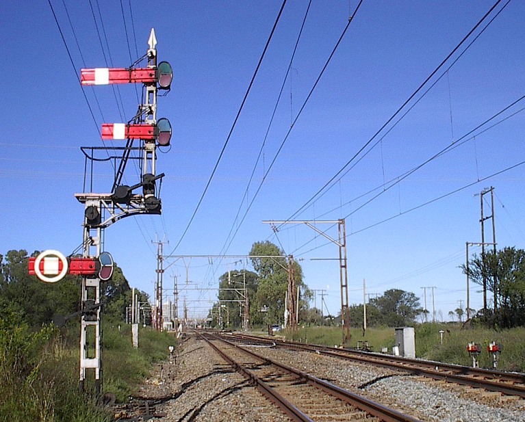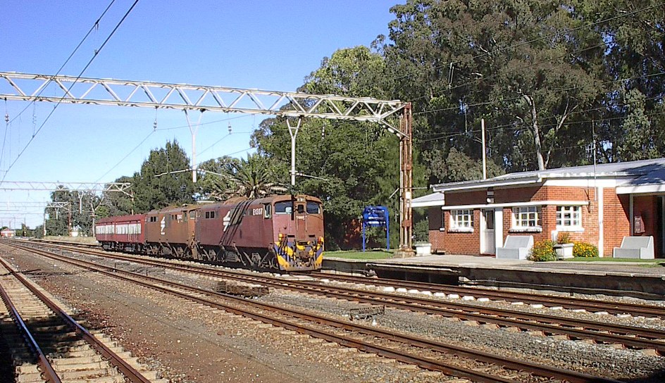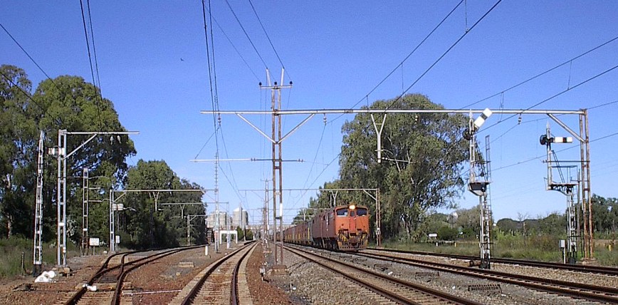 The Vereeniging to Kroonstad section of the Free State main line from Johannesburg to Bloemfontein still features a number of stations with lever frames and semaphore signals, including this location, situated 31 kms north of Kroonstad and 168 kms south of Johannesburg. The line is double track and electrified and there are passing loops in each direction, as well as a goods line. This pictures shows the signal cabin in the front of the station building. 2 6E1 locomotives can also be seen hauling two cabooses, waiting in the loop alongside the platform for the northbound Algoa passenger train to pass on the mainline.
