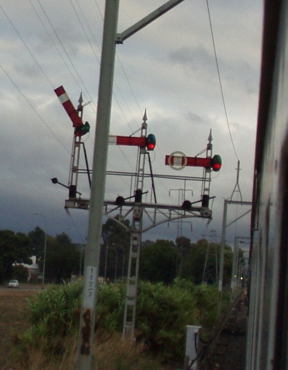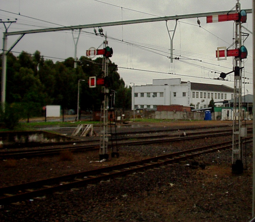 Huguenot is in the town of Paarl and is actually more in the centre of town than the station that bears the town's name. Paarl and Huguenot are the last two stations on the Cape main line with semaphore signalling, both featuring lever frames with 40 levers. This picture shows the down starting signals from the loop and goods lines.