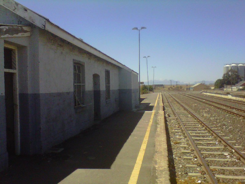 Klipheuwel is on the long branch that leave the main Cape Town-Johannesburg line at Kraaifontein and continues for a distance of almost 500 kms to Bitterfontein. There was full semaphore signalling with a frame of 20 levers which was removed in the mid-90s when this section was converted to radio operation. In this 2011 shot, you can still see where the former signalling area, now bricked off, and where the signal wires entered under the platform, in the middle of the picture.