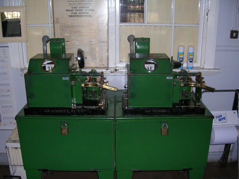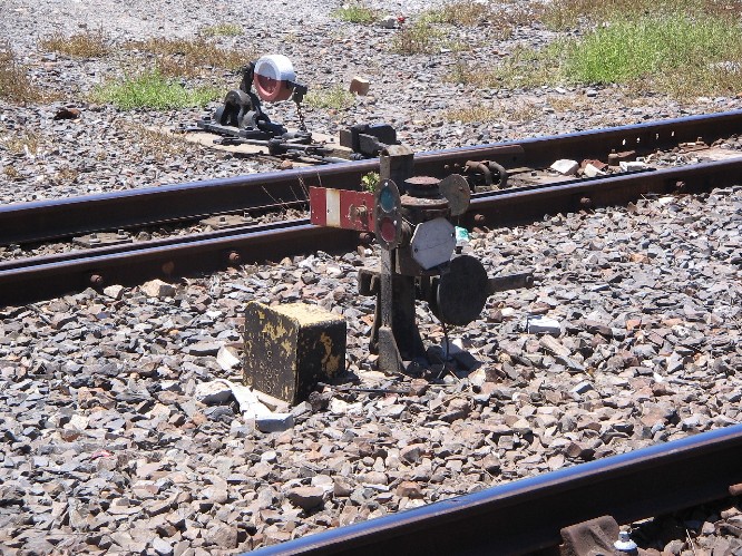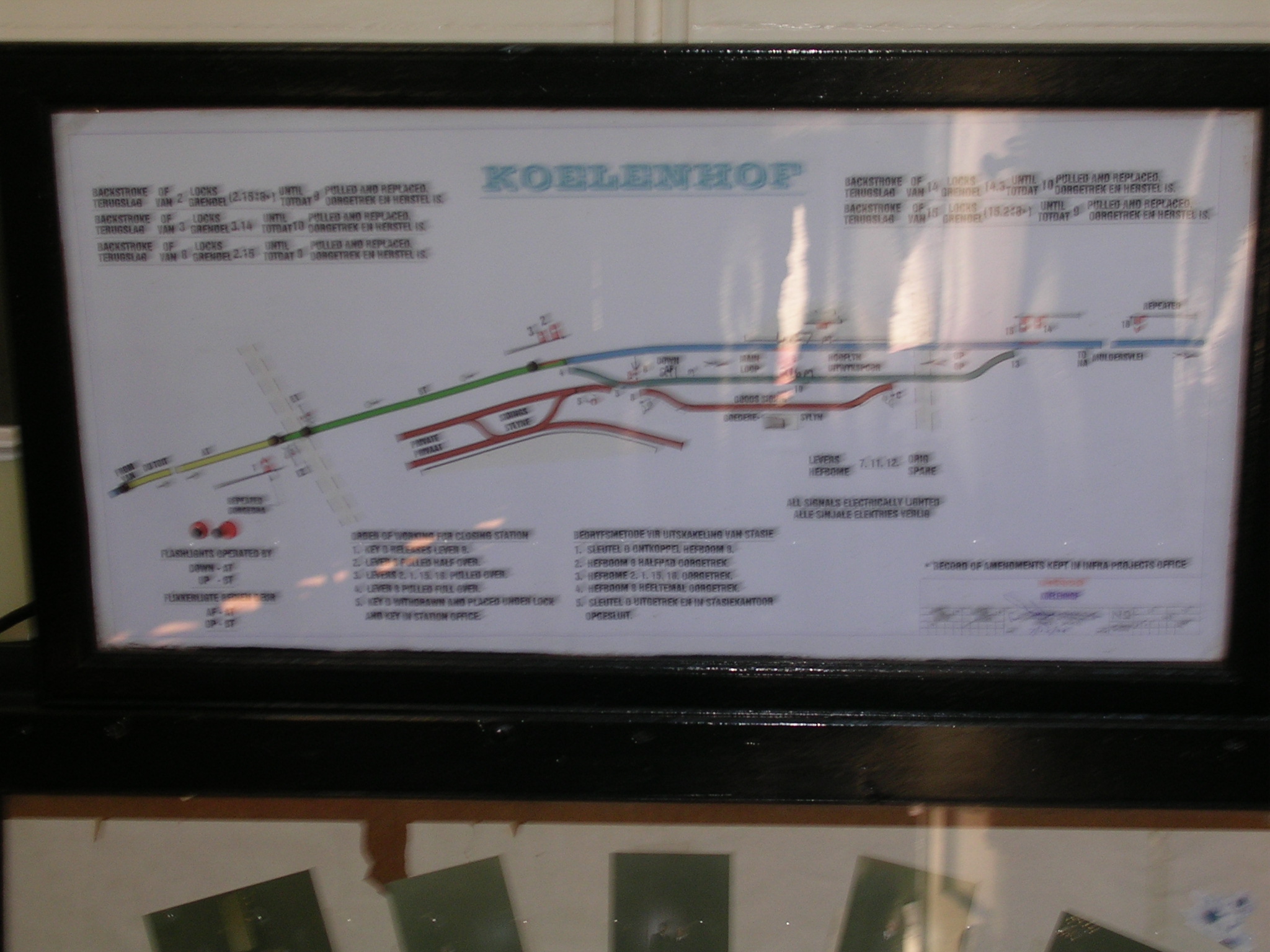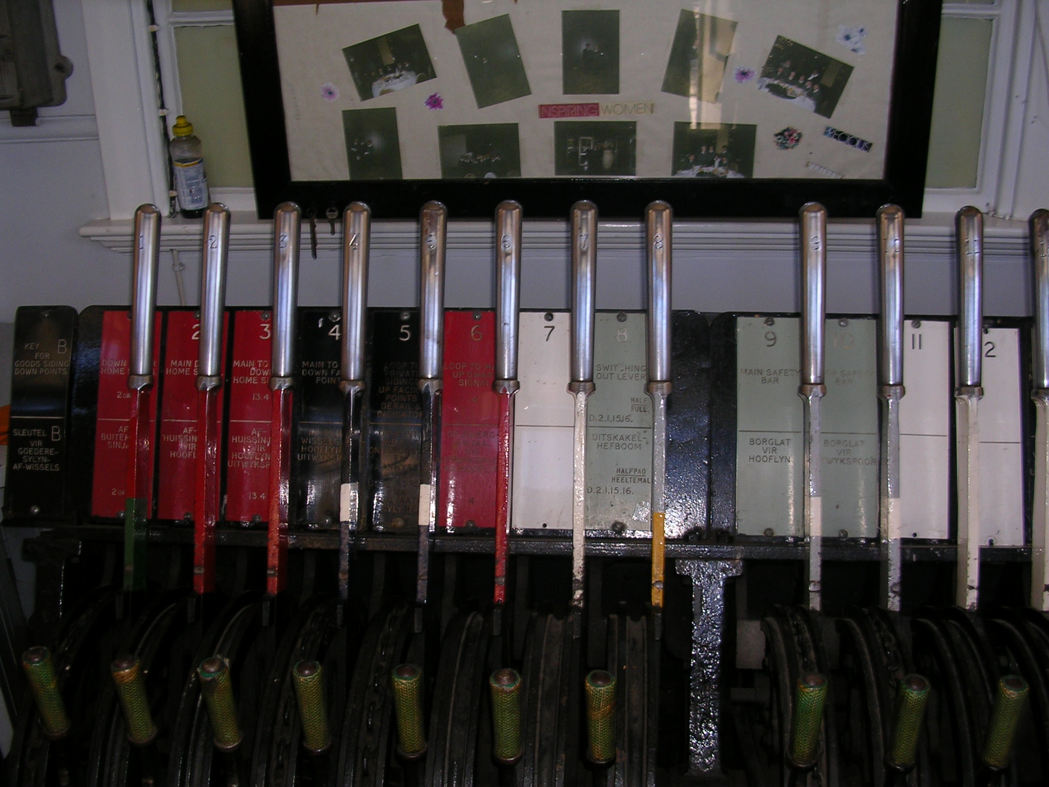 Here is the 16 lever frame for the station. It appears that this installation will be closing soon with control transfering to the Muldersvlei panel in early 2008. Again, you can click for a larger view.