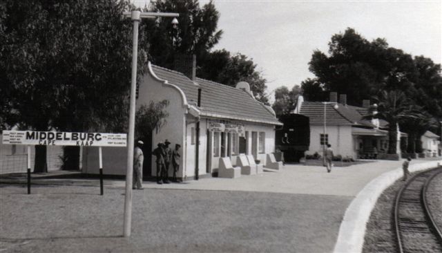 Middelburg was on the line from Mossel Bay that connected with the main Port Elizabeth line at Rosmead -indeed it is only 10 kms from Rosmead but the main Port Elizabeth line bypasses the town. The section from Klipplaat to Rosmead is now closed to rail traffic. In better times, Middelburg had a small lever frame which was in the front area of the station building. This 1978 shot from Richard Niven's collection shows the station building in 1978 with 19B locomotive 1412.