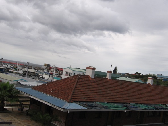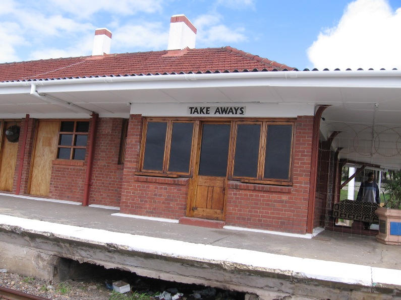 Mossel Bay is a small port on a peninsula in the Southern Cape. The Cape Town to Port Elizabeth line bypasses the town, going past the Voorbaai yards, but a short branch line goes into the town centre and the harbour. The classic train from Mossel Bay to Johannesburg via the Outenikwa, Toorwater and Lootsberg passes started and terminated here, but that is now a memory, although the line is seeing action again with the diversion of the Outenikwa Tjoe Tjoe, due to flooding on the Knysna line. A small signalling installation with 8 levers was situated here, and as with many stations in the area, is now a catering establishment. In this picture, you can see the gap in the platform where the signal wires were placed.