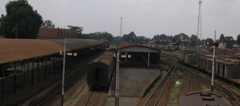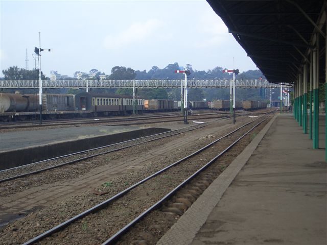 Looking in the easterly direction from a bridge to the east of the platform (in the Uganda direction), here is an array of home, starting and shunt signals. The road crossing in the distance is the main road to Mombassa and the airport.