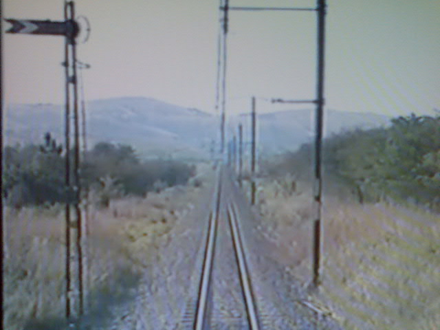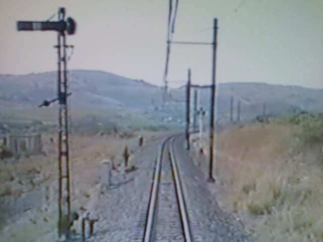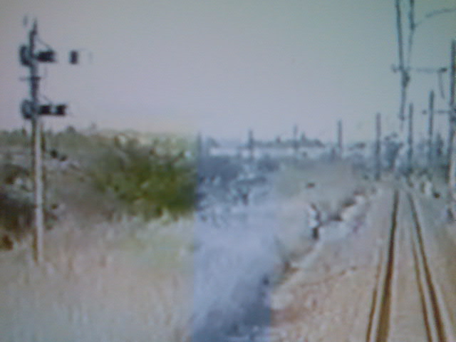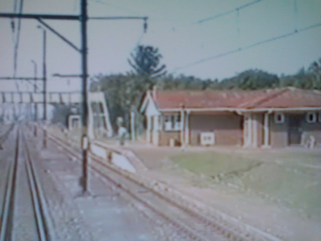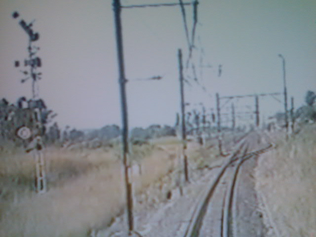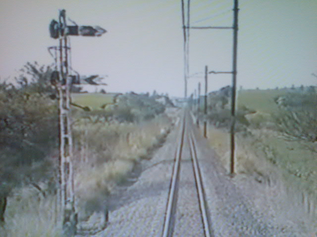 Nyoni is on the North Coast main line from Durban to Empangeni, 114 kms from Durban. The section from Stanger to Empangeni had semaphores and Van Schoor working until 2001, when it was converted to track warrant. These pictures, provided by Greg Hart are from a road knowledge training video, hence the quality -however they still give a good record of semaphores on this line. This picture shows the station building and signal box in the front of the station buildings. There were 32 levers in the signal box, with Amatikulu and Mandini the nearest signal boxes to the south and north respectively. There was also a remote controlled interloop, Isithebe, to the south.