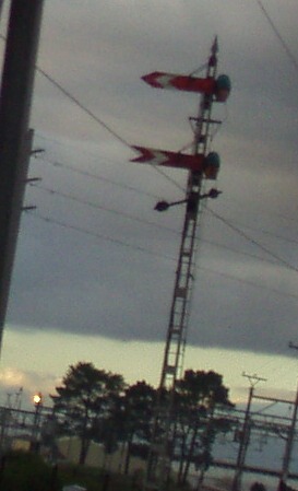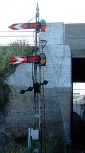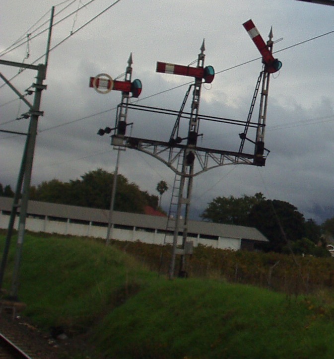 The classic gantry of three home signals was once a feature of stations on South African main lines all over the country- one of the last reminders of this is at Paarl as picured here, this is the up home signal. The circle around the lowest signal indicates that this line is for goods trains. Another common feature on South African main lines was the combination of outer home signal (top) and distant signal (bottom). Here is the down combination for Paarl.