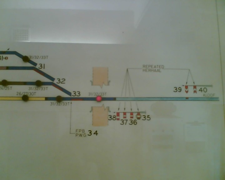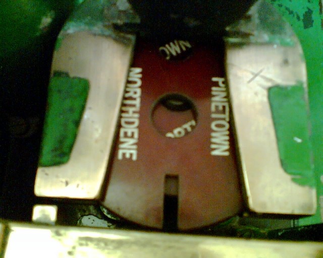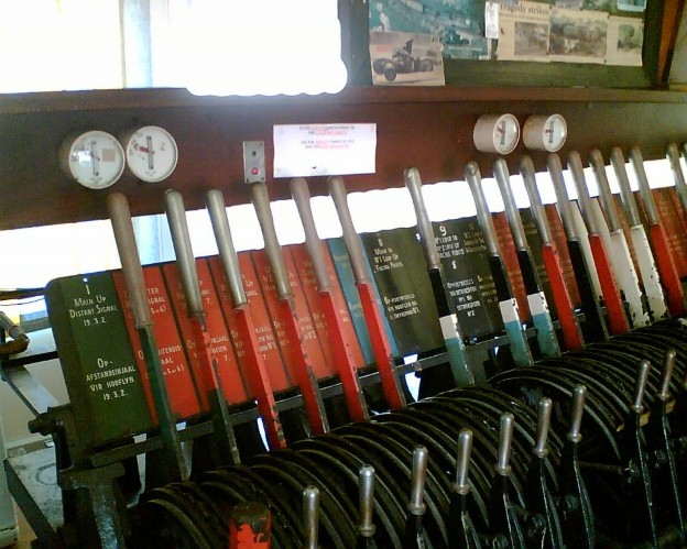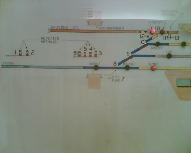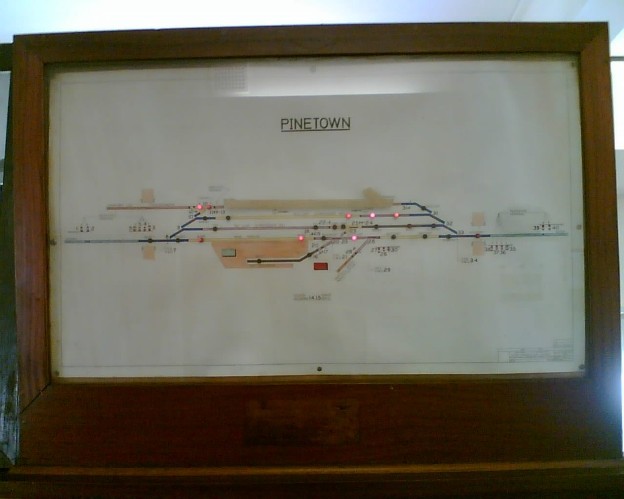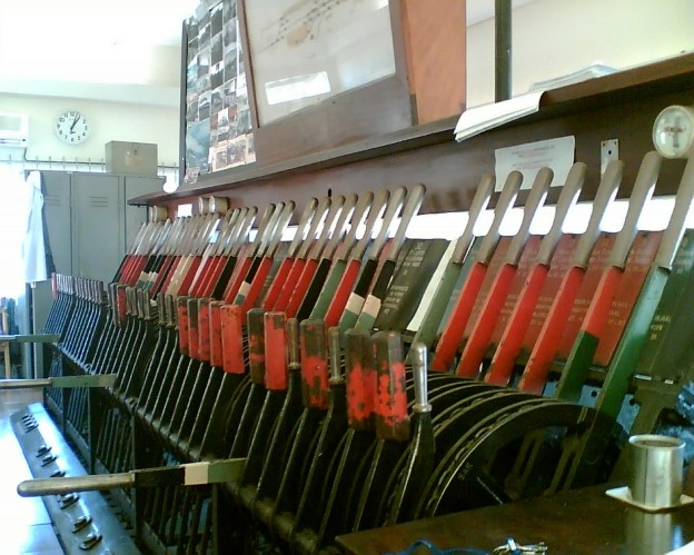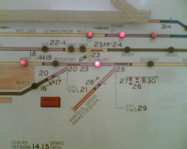 The signalling diagram for Pinetown. First picture is the whole diagram, then more detail from left to right. Lever frame for Pinetown. Train register and radio in the signal box. Van Schoor single line token machine, and a token for Northdene. All pictures by Greg Hart. Back to the main Pinetown page Back to the home signal page!