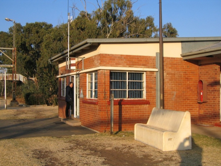 The Vereeniging to Kroonstad section of the Free State main line from Johannesburg to Bloemfontein still features a number of stations with lever frames and semaphore signals, including this location, situated 51 kms north of Kroonstad and 148 kms south of Johannesburg. This pictures shows the signal cabin in the front of the station building with Eugene Armer enquiring whether any trains were approaching. The station building is on the west side of the tracks.