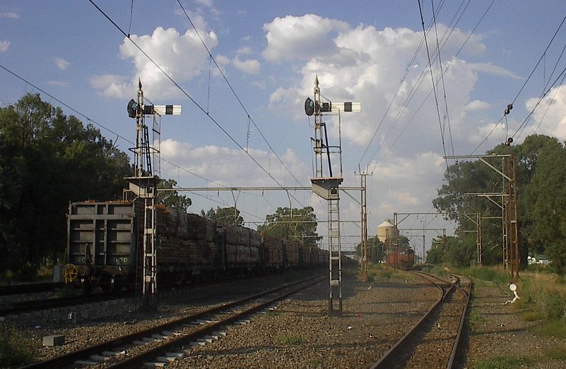 The starter signals at the south end of Rooiwal, looking north. The 6E1's in the siding on the right have just dropped their load on the southbound main, the loco's have been switched off and the crew picked up by Kombi to go home..........obviously they had run out of time. There was probably no relief crew available, so the load will stand. The starter signal on the right soon saw action as the following train was put through the loop.Picture taken by Eugene Armer on 15 December 2006.