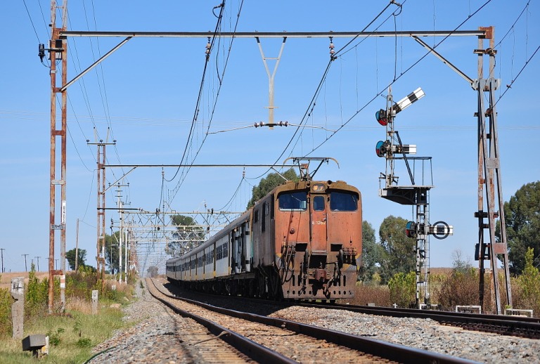 On 13th April 2009 (Easter Monday), train 37012 "Tourism" from Port Elizabeth to Johannesburg, approaches Rooiwal behind a very grubby class 6E1 E1262. Photo by Eugene Armer.