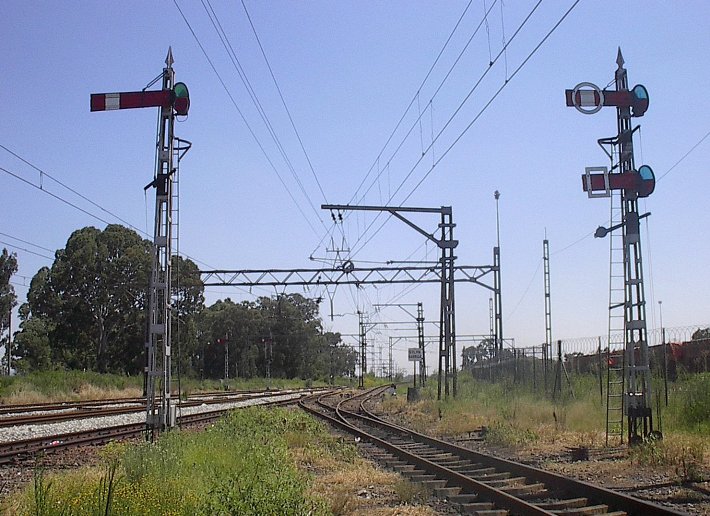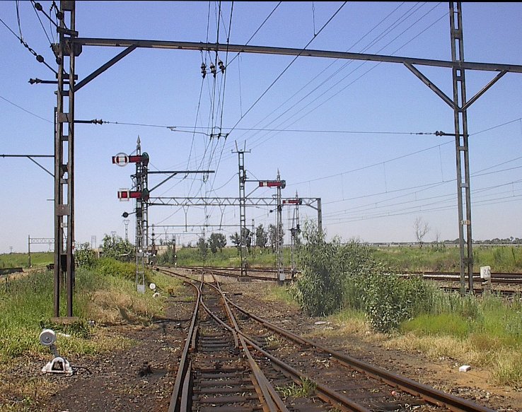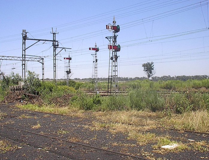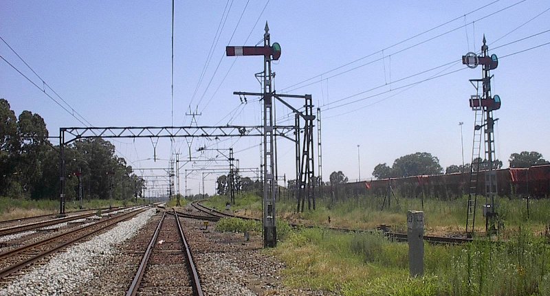 The Vereeniging to Kroonstad section of the Free State main line from Johannesburg to Bloemfontein still features a number of stations with lever frames and semaphore signals. Most of them are on the southern part of this section, but Viljoensdrif is at the north end of the line, situated just south of the Vaal River between the industrial complexes of Sasolburg and Vereeniging. These two pictures show the north end of the station, looking north towards Vereeniging. On the left is the starter for northbound trains departing from the southbound side loop. On the right the starter for northbound freights departing the yard, plus the shunt signal for a spur that takes off to the right.